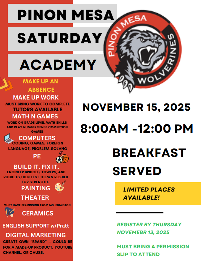 Saturday Academy November 15th Attached Files 2025 November PMMS Permission Slip (1).pdf November 2025 Pinon Mesa Saturday School Flyer (2).pdf (Spanish) (1).pdf Spanish 2025 November PMMS Permission Slip (1).pdf